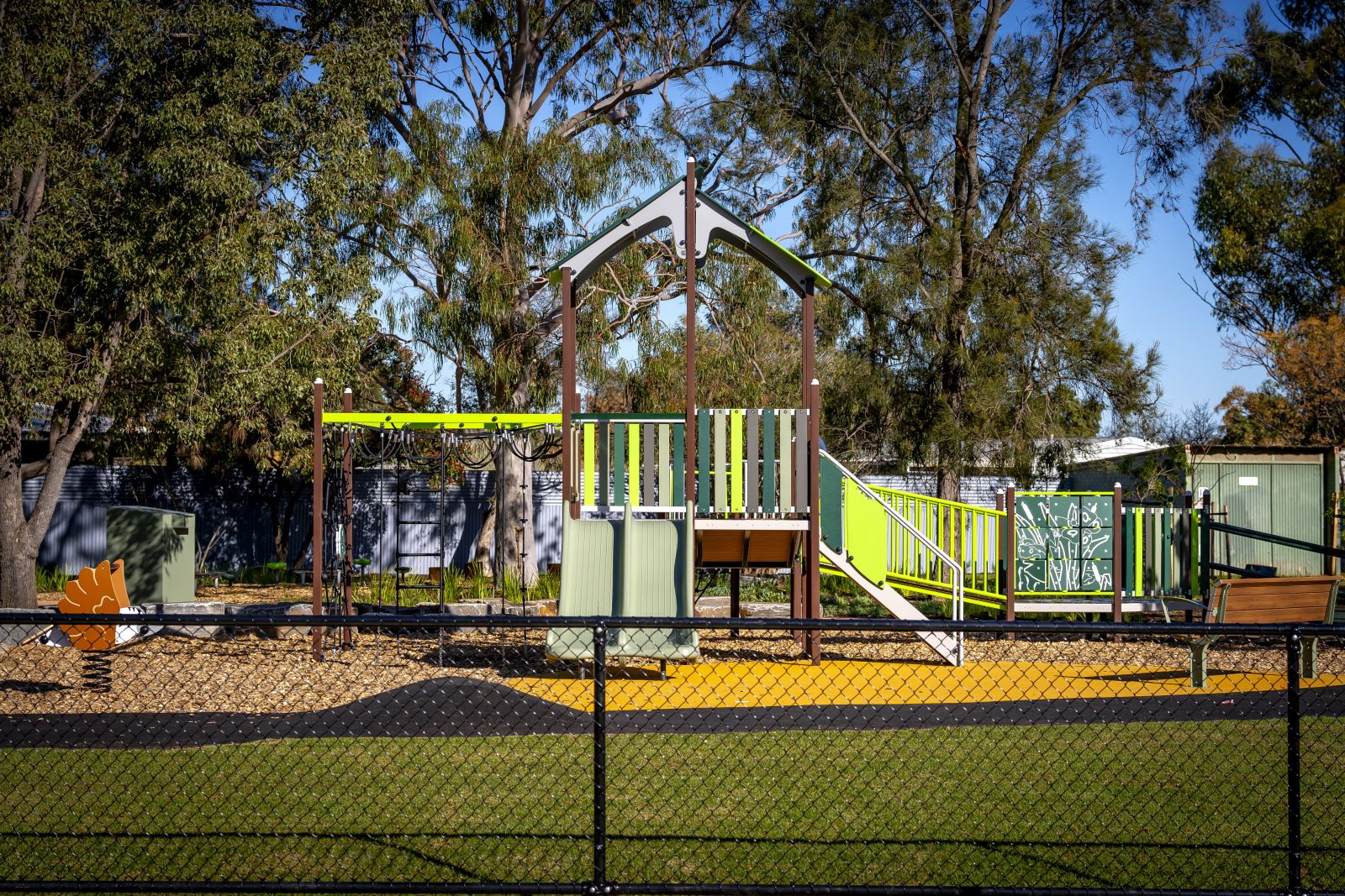 - Balance Beam, Climbing, Fenced Play Area, Flying Fox, Slide, Swings